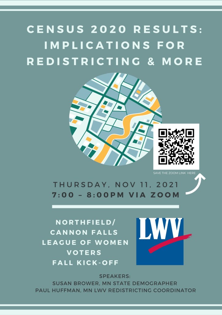 Join us to hear from Susan Brower, MN State Demographer, and Paul Huffman, MN LWV Redistricting Coordinator